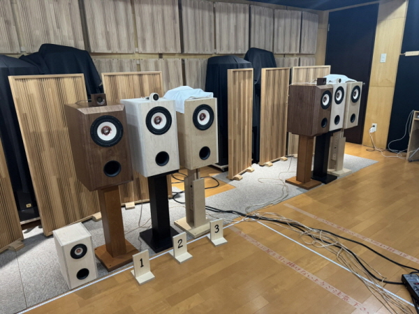 回は試作中の2種類の視聴をしました。同軸16㎝のユニットを使った2種類(1と2)と、16㎝ウーファーとツイーター構成の2ウェイ(見た目はZ800-FW168HRのよう)の2種類(3と4)で計4種類を試聴しました。