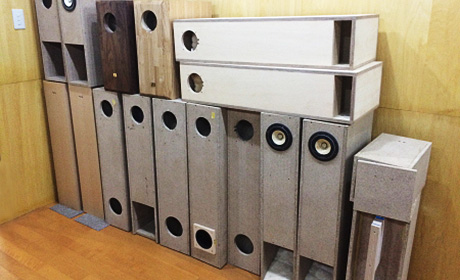 基本設計を終えたスピーカーシステムは、エンクロージャーに使う木材や板厚を変化させて同じものを試作したり、吸音材、ダクト調整などを経て1台を完成させます。