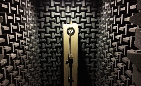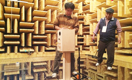 弊社ではリスニングルーム隣に簡易的な無響室を備えておりまして、こちらでスピーカーの周波数特性を測定に活用しています。こちらの無響室は専門設計をされている若林音響様に設計を依頼し弊社で自作した2畳ほどの簡易無響室です。(この無響室は特性をだすために2度作り変えています。[画像1]は小野測器様の無響室での測定風景です。)