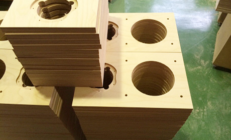 弊社で仕入れた木材はノギスでベニヤの厚みの誤差等を計算した上でスピーカーキットの木取りをします。高い精度をだすためにNC加工機や昇降盤などを使って時間と手間を惜しまずに加工をするので通常ホームセンターのパネルソーカットでは±1mmぐらいが基準ですが、弊社では±0.2mmの高い加工精度をだしています。