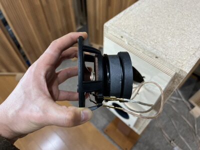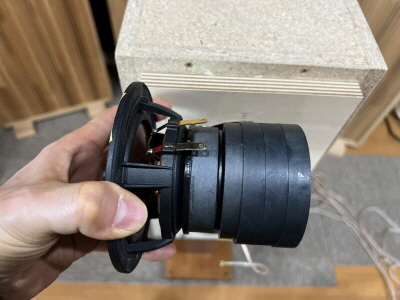 音工房でテストしてよかった背面マグネットマークが新設計したモデルのほうがどちらも高域が繊細で表現力が高く皮が一枚向けたような透明感がありました。トータルでは完全にマークが新設計したユニットのほうが上でしたが、ミッドバスについてだけは弊社でマグネットを取り付けてQtsを落としたもののほうが芯があり良いかなという印象でした。このユニットの1回目の試作を受け取った時点で10センチのフラッグシップモデルとして採用するという気持ちは固まりました。