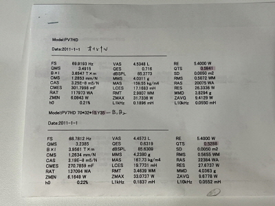 サンプルのTS弊社で背面にマグネットをつけて視聴したユニットに比べて、音が繊細で表現力があがりました・特に高域がよくなった印象でした。2パターンの頂戴したスペックシートは写真右 です。Qtsの値はマークオーディオが測定したもので、Qts0.56(高Qts)とQts0.52(低Qts)です。ちなみに原型のオリジナルはQtsが0.59です。