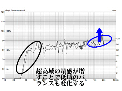 “超高域というより可聴域全体で ツヤというか音の質感が向上する(実体感が向上する) おそらく高域に至るインピーダンスがSP全体として下がる影響だと思うが、専門家による 学術的な考察は見たことがない。 ”