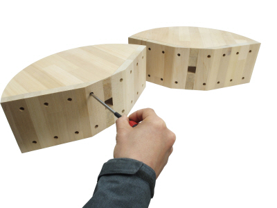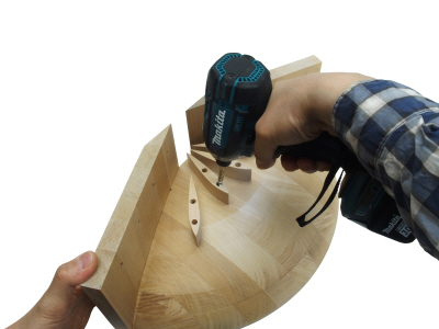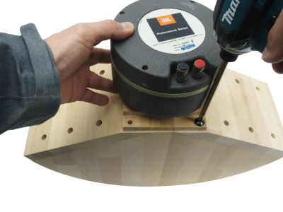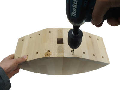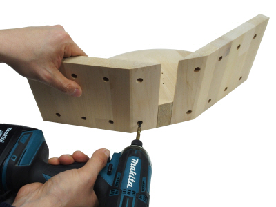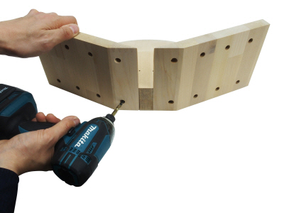 Z503-Woodhornの最大の特徴はボンドを使わずにビスのみで仮組みをしてすぐに音出しが可能な点です。ホーン本体の木口にはφ3の下穴があけてありますので、付属のビスで簡単に側板ととめることができます。