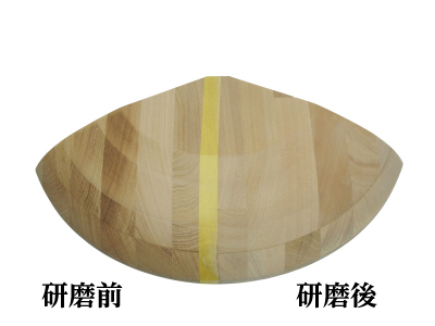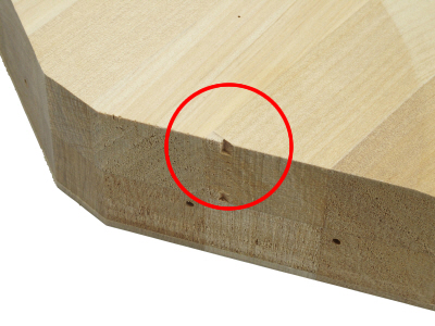 集成材は製造過程で、上の写真のような「チップ抜け」が一定量必ず発生します。10mm角以上の大きなものは弊社でパテにて修正いたしておりますが、それより小さいサイズのものはお客様のほうで木工パテにて修正をお願いします。