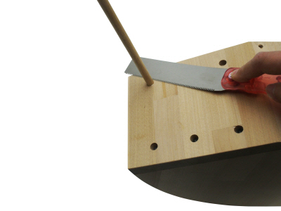 側板の接着を終えましたら、背面丸穴に少しボンドを入れ、丸棒を叩きいれます。のこぎり(アサリなし)で丸棒をカットしてできあがりです。<作業時間目安 1時間>