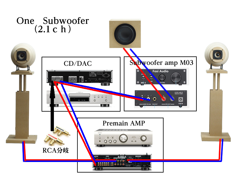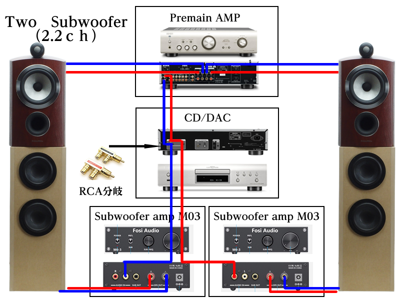 (サブウーファー2つ)プリアウト可能なアンプ FOSTEX AP25など